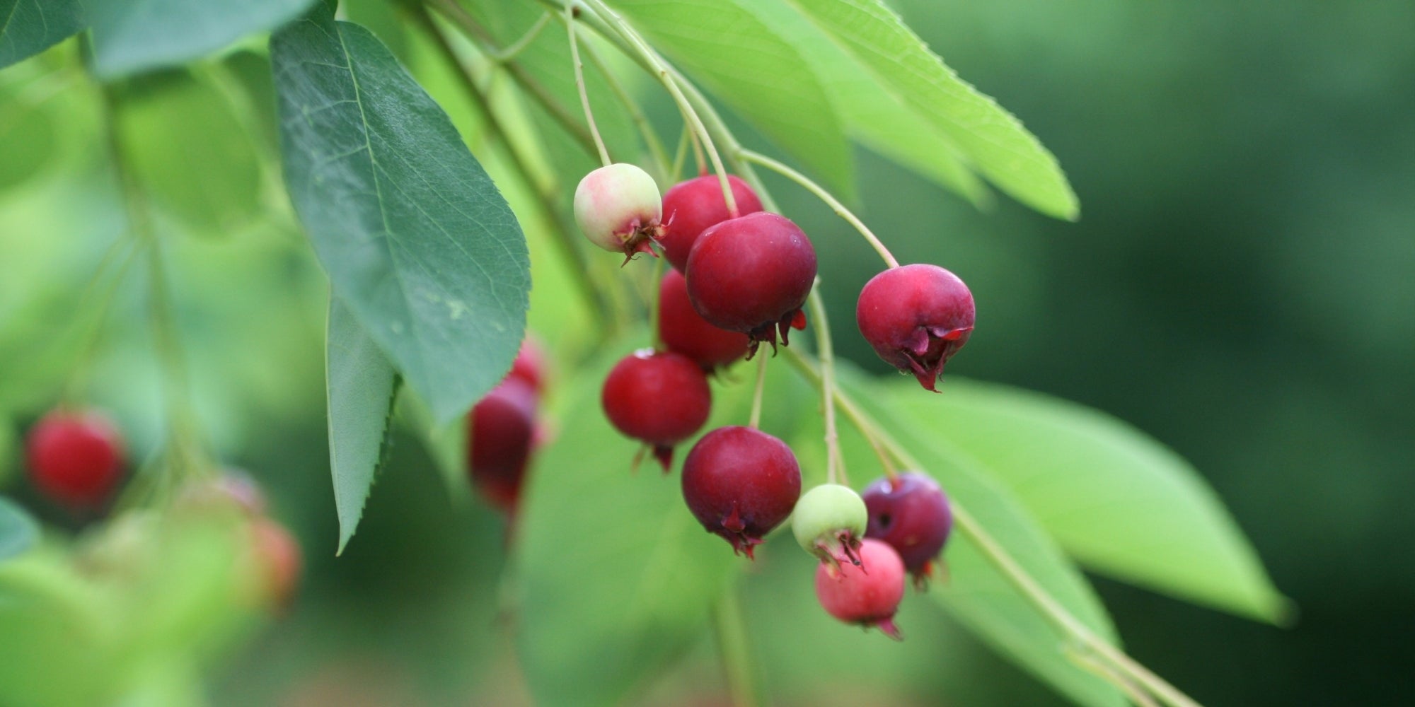It produces small, sweet, edible purple-black berries in early summer that are excellent for fresh eating, pies, jams, and attracting birds and wildlife.