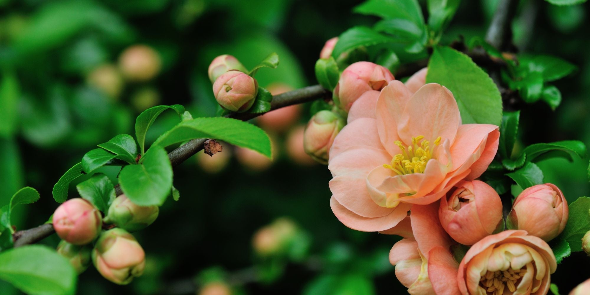 Chaenomeles Speciosa 'Cameo' - 'Cameo' Flowering Quince is a is a deciduous, compact, multi-stemmed, low growing flowering shrub with peachy blooms. Blooms are showy, textured blooms with multiple layers of petals that appear on old growth in early spring and persists through summer. The branches are decorated with oval to oblong shaped leaves, soft apricot- blush shade blooms in the Spring and no thorns! This is one of the first burst of colors as buds begin to bloom in early spring. Soon after, new foliage emerges a red tinted shade that later emerge to a glossy, dark green in Summer. Small yellowish-green drupes begin to appear in late Summer and can develop red tinged once matured in Autumn.
