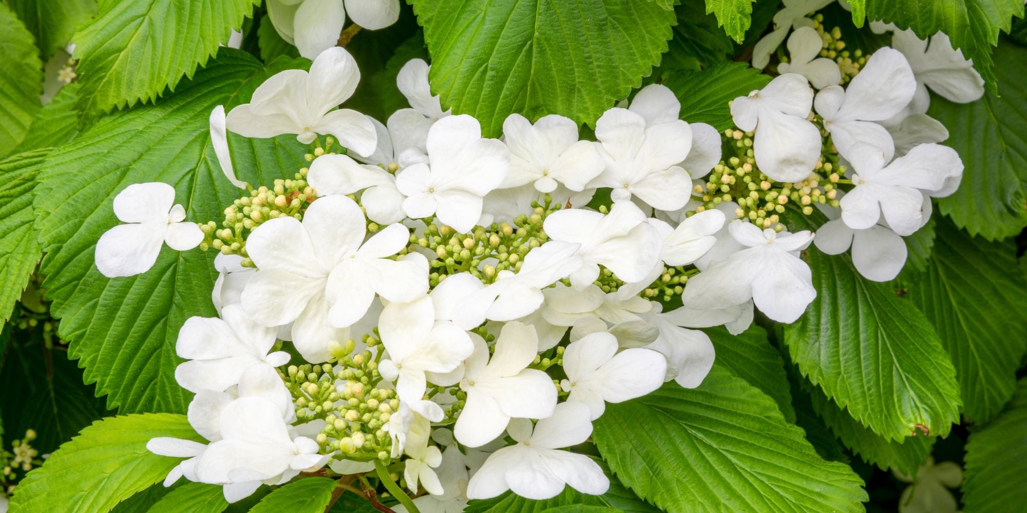 The Viburnum Plicatum Var. Tomentosum 'Mariesii' - 'Mariess' Viburnum, also called the wedding cake bush and Doublefile Viburnum, is a large, multi-stemmed, wide, rounded forming shrub. Horizontal branches give a beautiful tier look, large white lacecap-like flower clusters and sharp toothed, oval, dark green leaves. Flowers bloom in flat, pure white clusters from April to May giving the impression of snow on the branches and are much enjoyed by butterflies and hummingbirds. These flower then give way to small, scarlet red fruits in the summer months which are enjoyed by birds in the colder months. In autumn, these lush green leaves becomes a deep maroon to vivid red, going out in a fiery autumnal show of saturated reds.