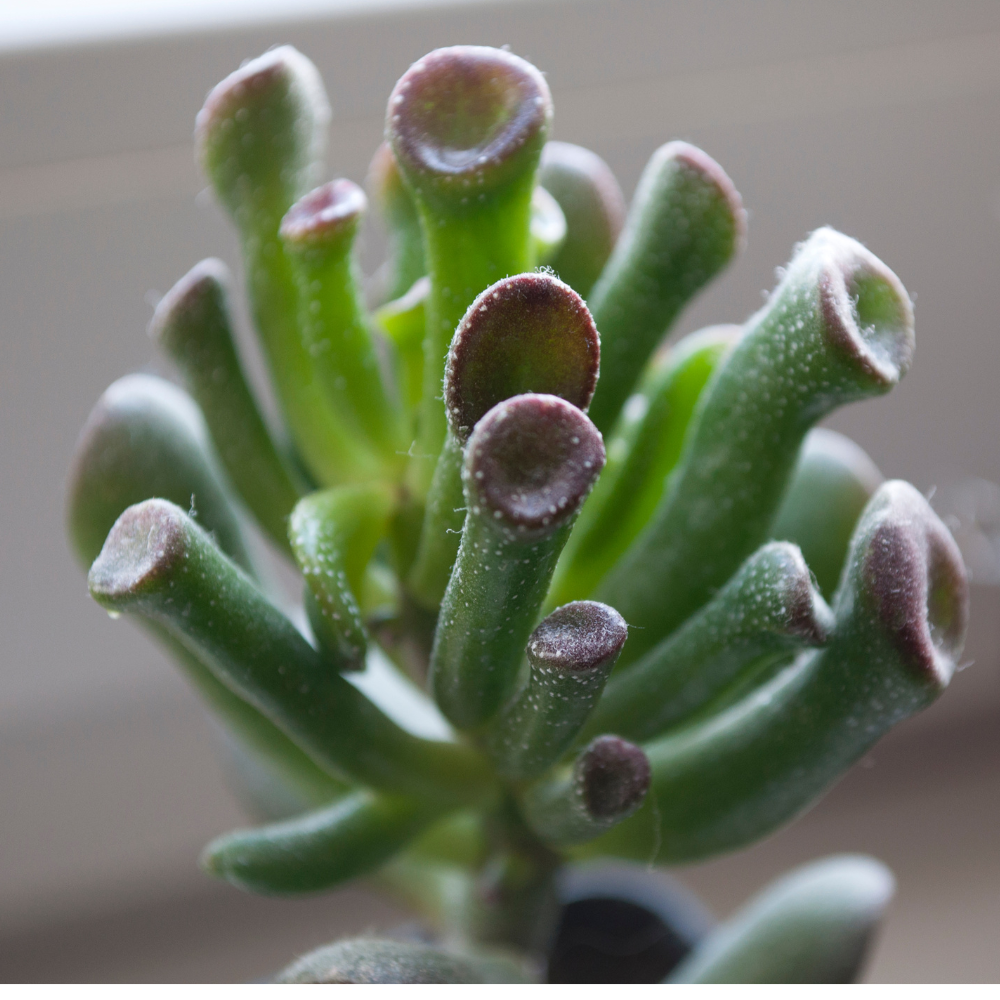 Features elongated, tubular green leaves with reddish tips that resemble tiny suction cups, giving it a whimsical, coral-like appearance.