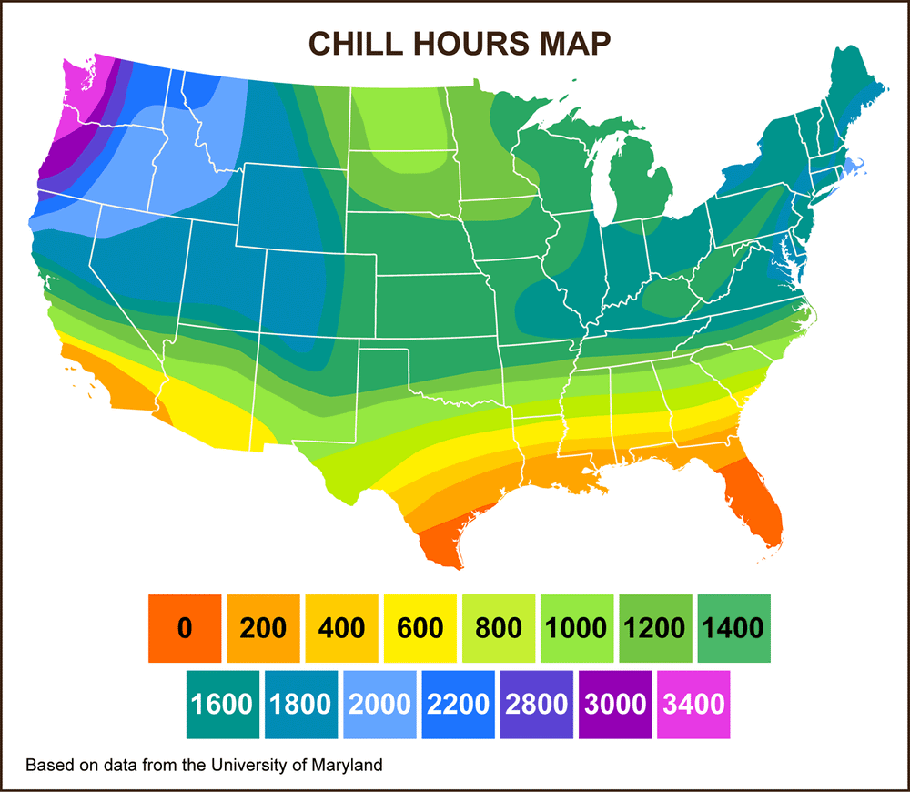 Has a chill hours (CU) requirement of 800–1000. (Chill hours are the average hours of air temperature between 32° and 45° F in a typical winter season.)